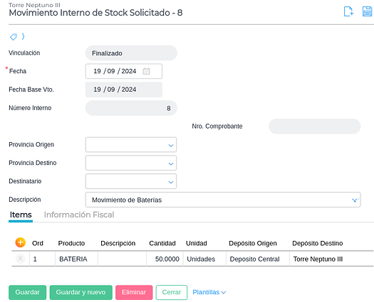 - Se continúa con la generación del Movimiento Interno de Stock Solicitado. Este documento también trabaja con el workflow de Solicitud de movimiento de stock y levantará los Pedidos de Movimiento Interno generados anteriormente. Además moverá stock de un depósito a otro.