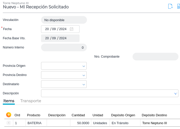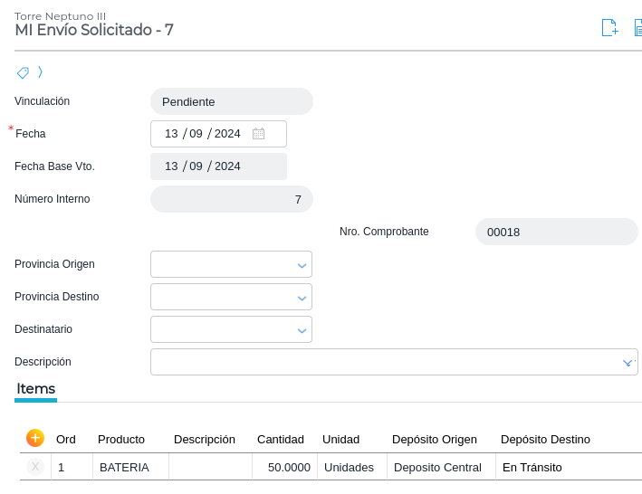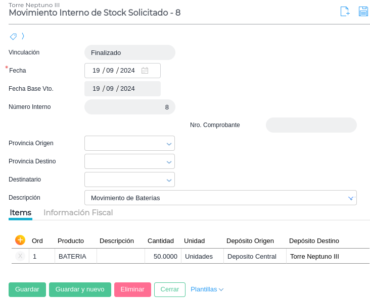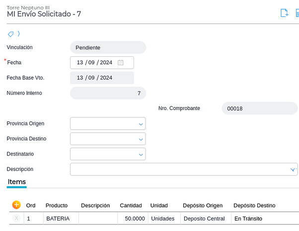 - Alternativamente, en lugar de utilizar el Movimiento Interno de Stock Solicitado, pueden usarse dos documentos, uno generado por el solicitante de los materiales y otro por el responsable que los enviará. Éstos apuntan a una mayor trazabilidad y además son muy útiles cuando el movimiento de los materiales transcurre durante dos o más días (por ejemplo, un traslado de una provincia a otra)