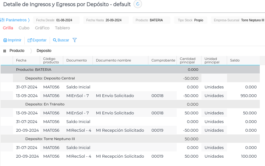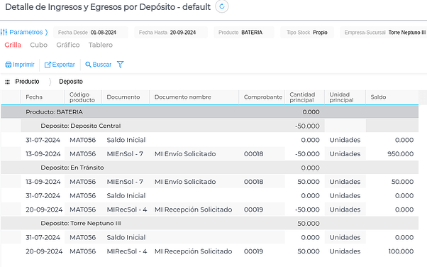 A medida que se van realizando las transacciones, se pueden visualizar en los informes de Inventarios, tales como el Resumen de Stock por depósito o el Detalle de Ingresos y Egresos por Depósito. En la siguiente imagen se observan los movimientos ocurridos de las 50 Baterías entre los depósitos Central, En tránsito y Torre Neptuno III: