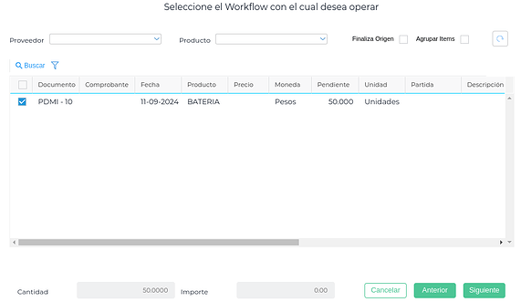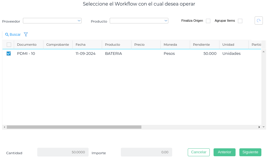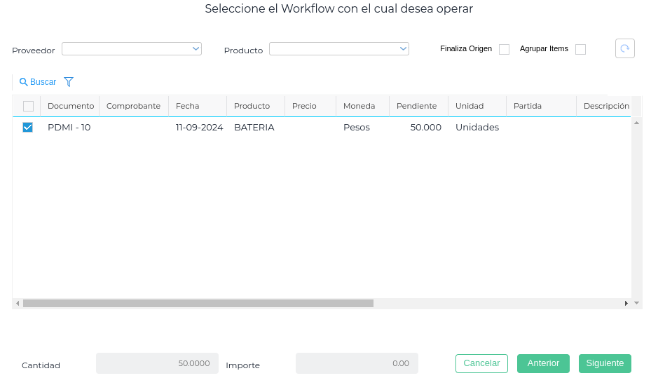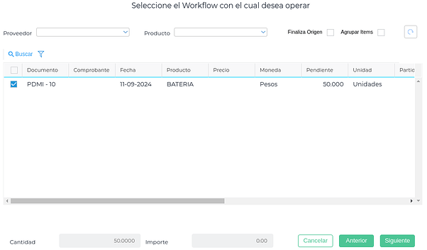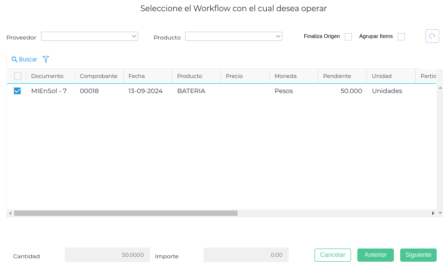 También estas transacciones tienen preseleccionado el workflow de Solicitud de movimientos de stock y se selecciona uno o más Pedidos de Movimiento interno: