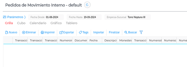 - Prosigue con el Pedido de Movimiento Interno. Se crea un nuevo Pedido mediante el botón Nuevo. También se pueden eliminar (si no tienen vinculados otros documentos), imprimir, exportar el listado a formatos txt, csv, Excel (xls) y Excel 2018 (xlsx), colocar tags y finalizarlos.