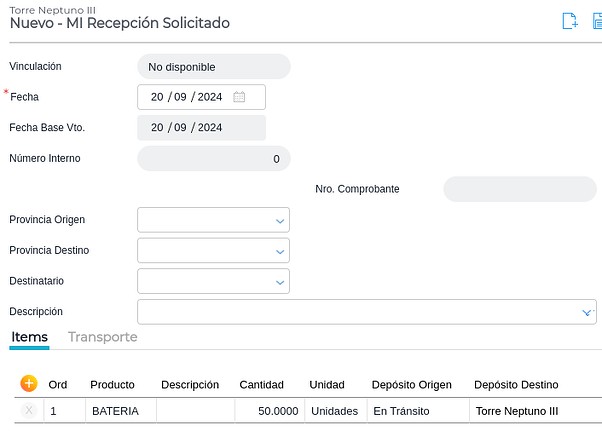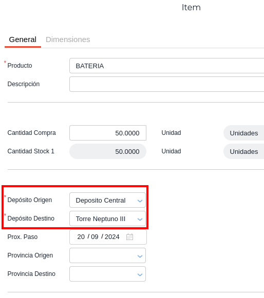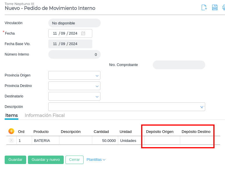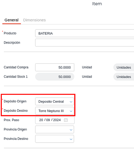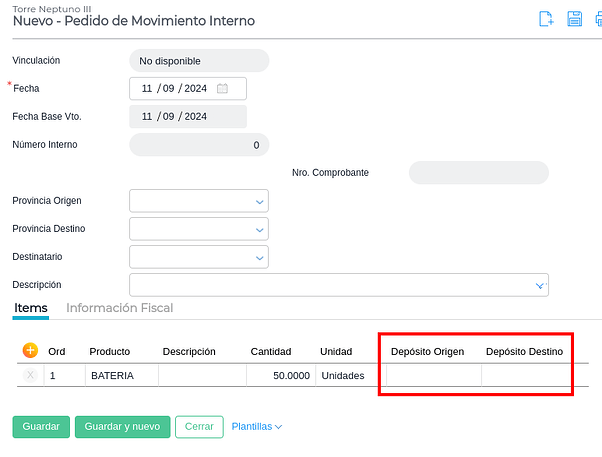 A la transacción que se genera hay que indicarles los depósitos de origen y de destino: