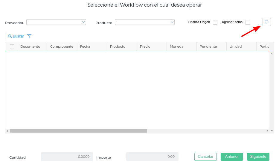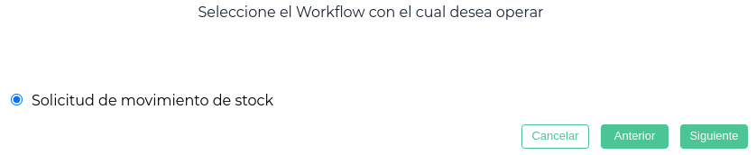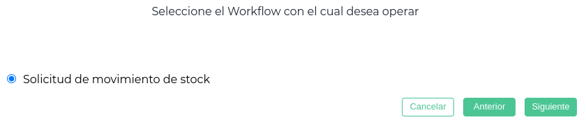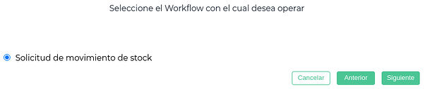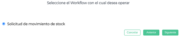 Clickeando en Nuevo se abre el asistente del workflow con el circuito preseleccionado de “Solicitud de movimiento de stock”. Se clickea en Siguiente.
