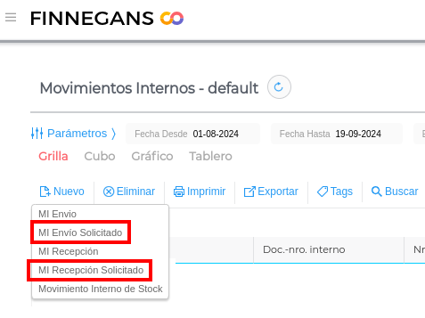 Son el MI envío solicitado y MI Recepción solicitado. Se encuentran en Menú → Gestión empresarial → Inventarios → Transacciones → Movimientos interno