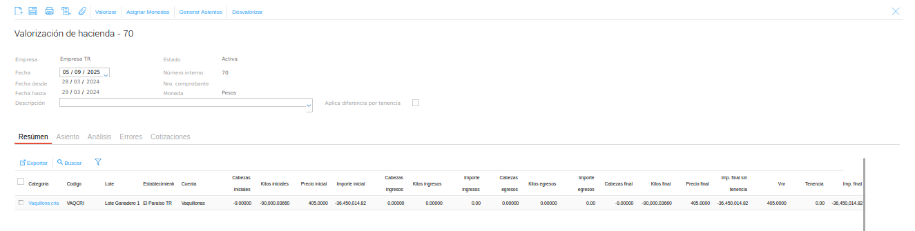 Ruta: Menú - Gestión Empresarial - Ganadería - Valorización de hacienda