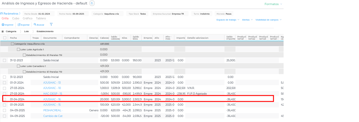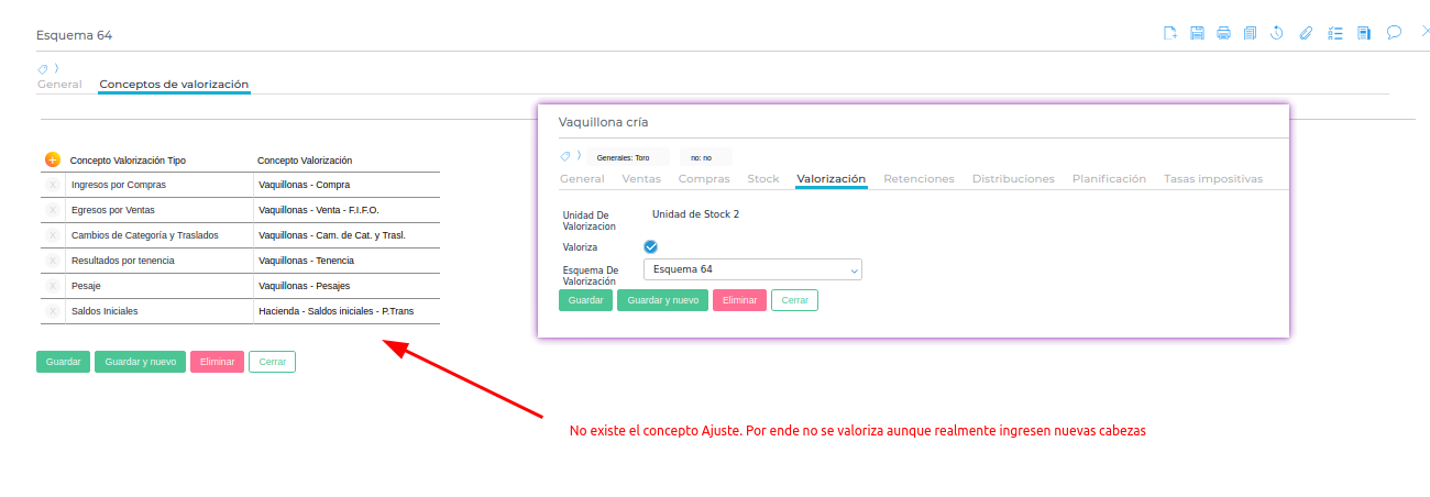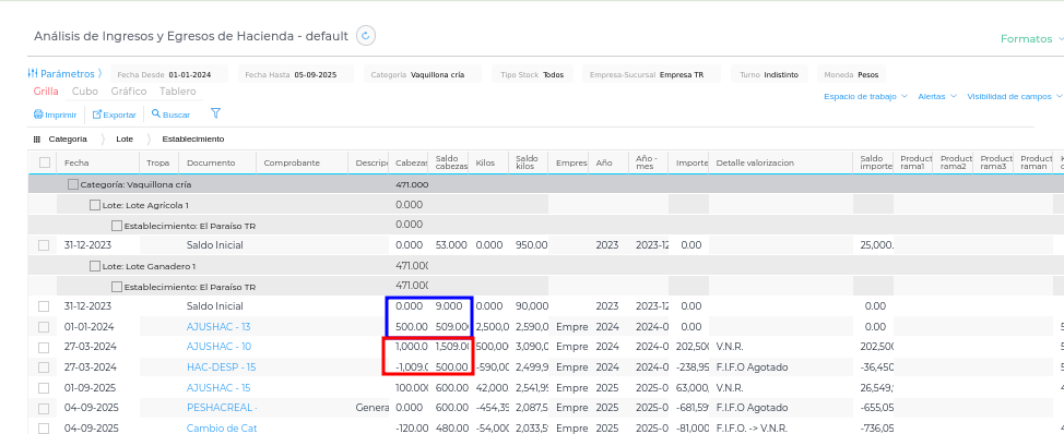 - Descripción del problema: Los movimientos iniciales, como el ingreso de animales (por ejemplo, por compra o nacimiento), se registraron en cierta fecha anterior a los períodos valorizados.