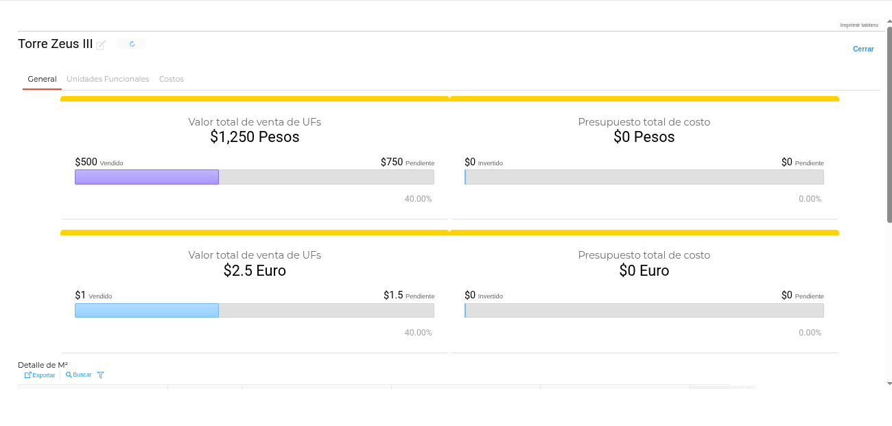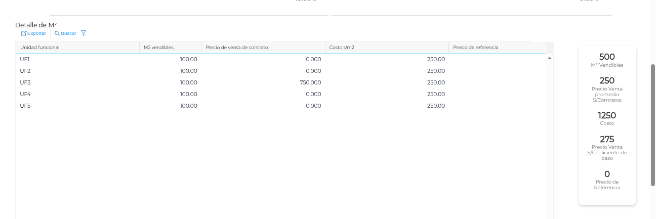 - Costo por m²: cálculo del costo total (directo + indirecto) dividido por los m² vendibles del proyecto.