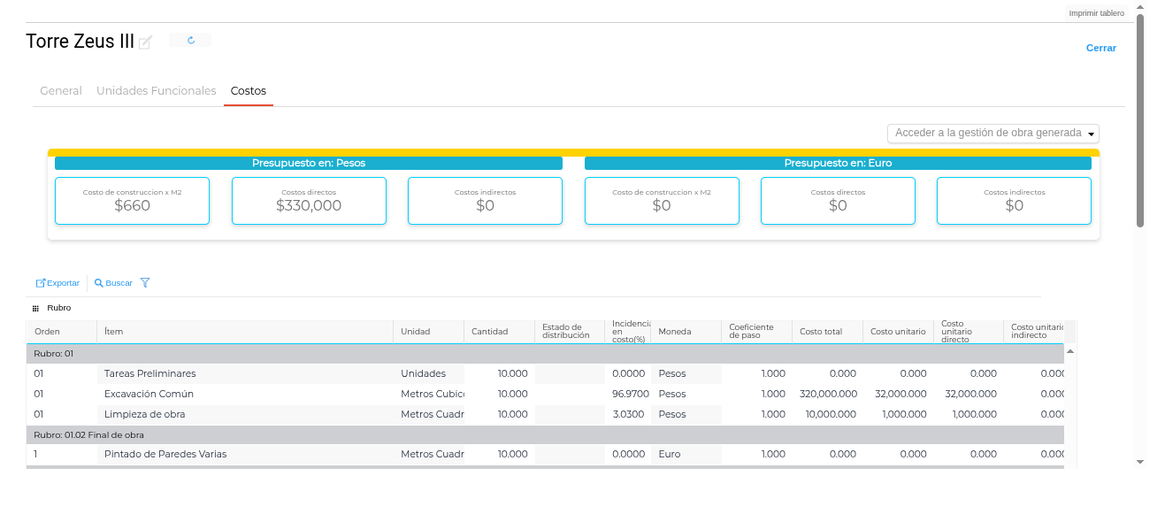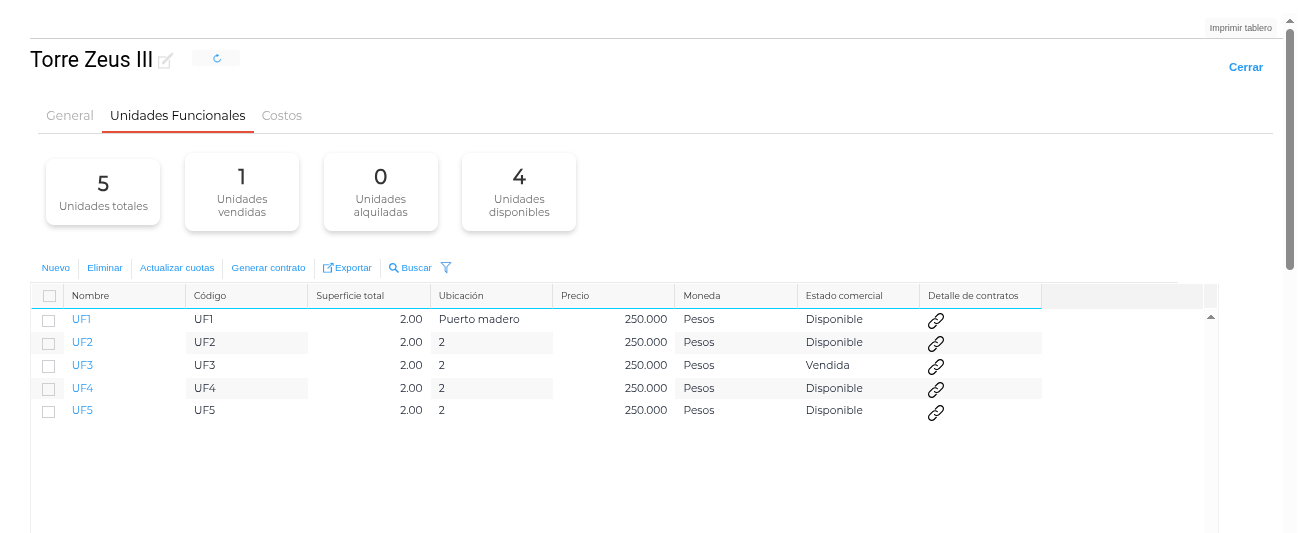 Las unidades creadas se mostrarán en la grilla principal y alimentarán los indicadores generales del proyecto.