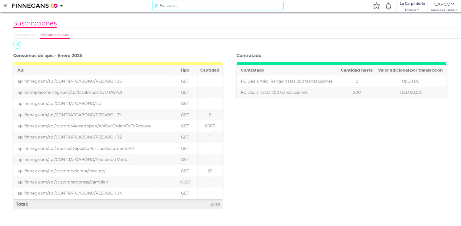 La app de Suscripciones incorpora una nueva funcionalidad que permite visualizar el consumo de las APIs utilizadas por mes, junto con la cantidad contratada.
