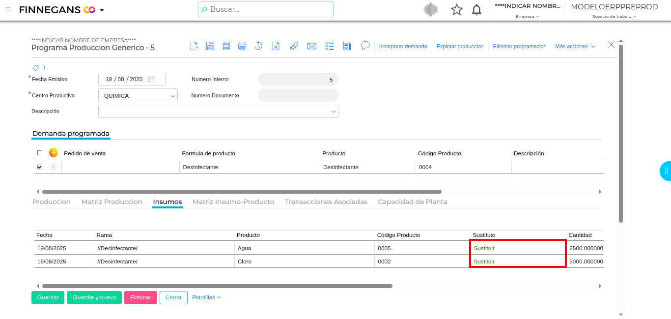 - La grilla de insumos se actualiza automáticamente con los sustitutos seleccionados y sus cantidades.