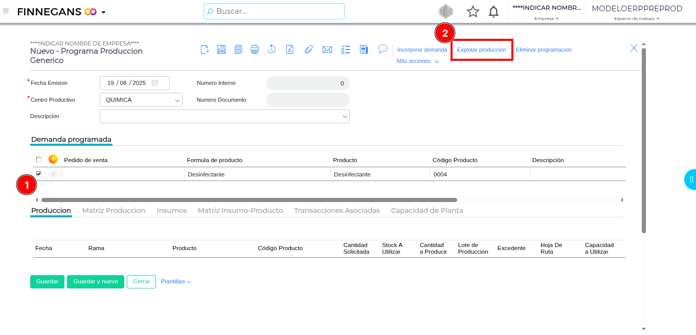 - Ingresar al Programa MRP y hacer clic en Explotar Producción para habilitar la solapa Insumos.