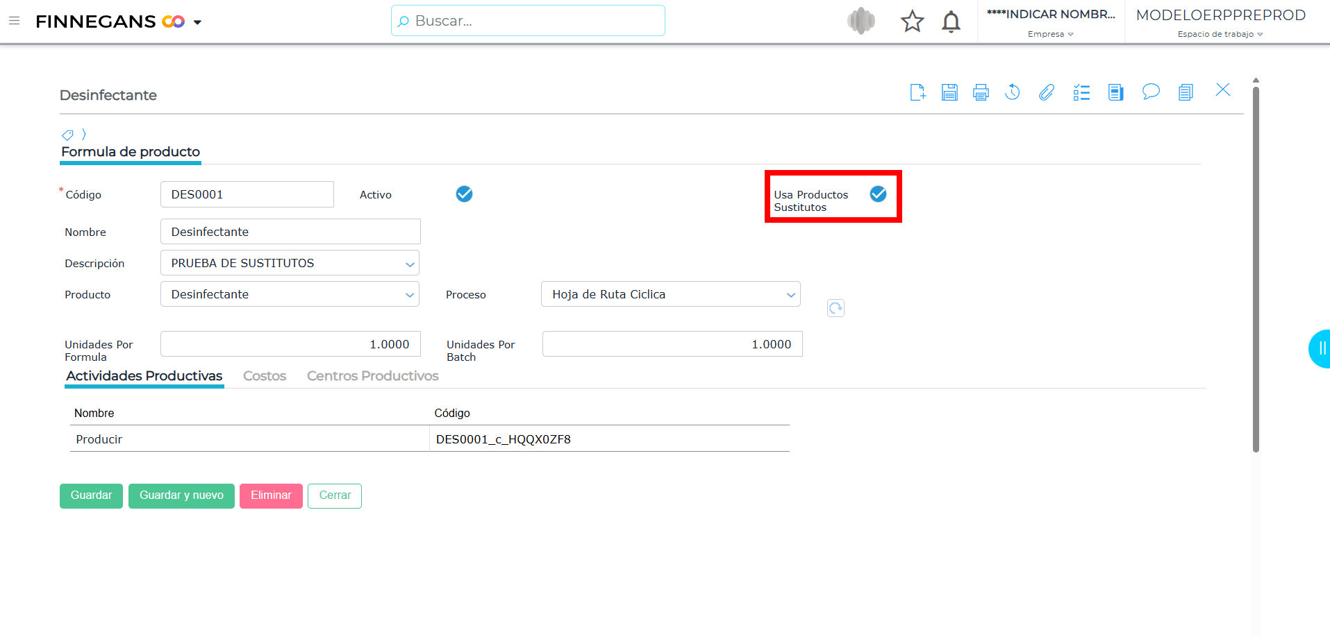 - Activar el check “Usa Productos sustitutos” dentro de la fórmula.