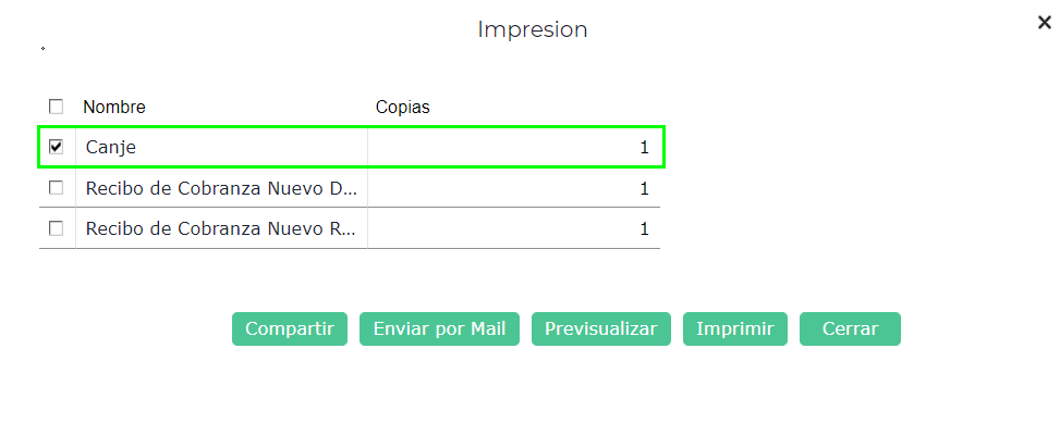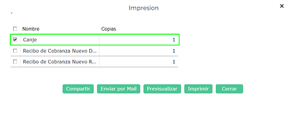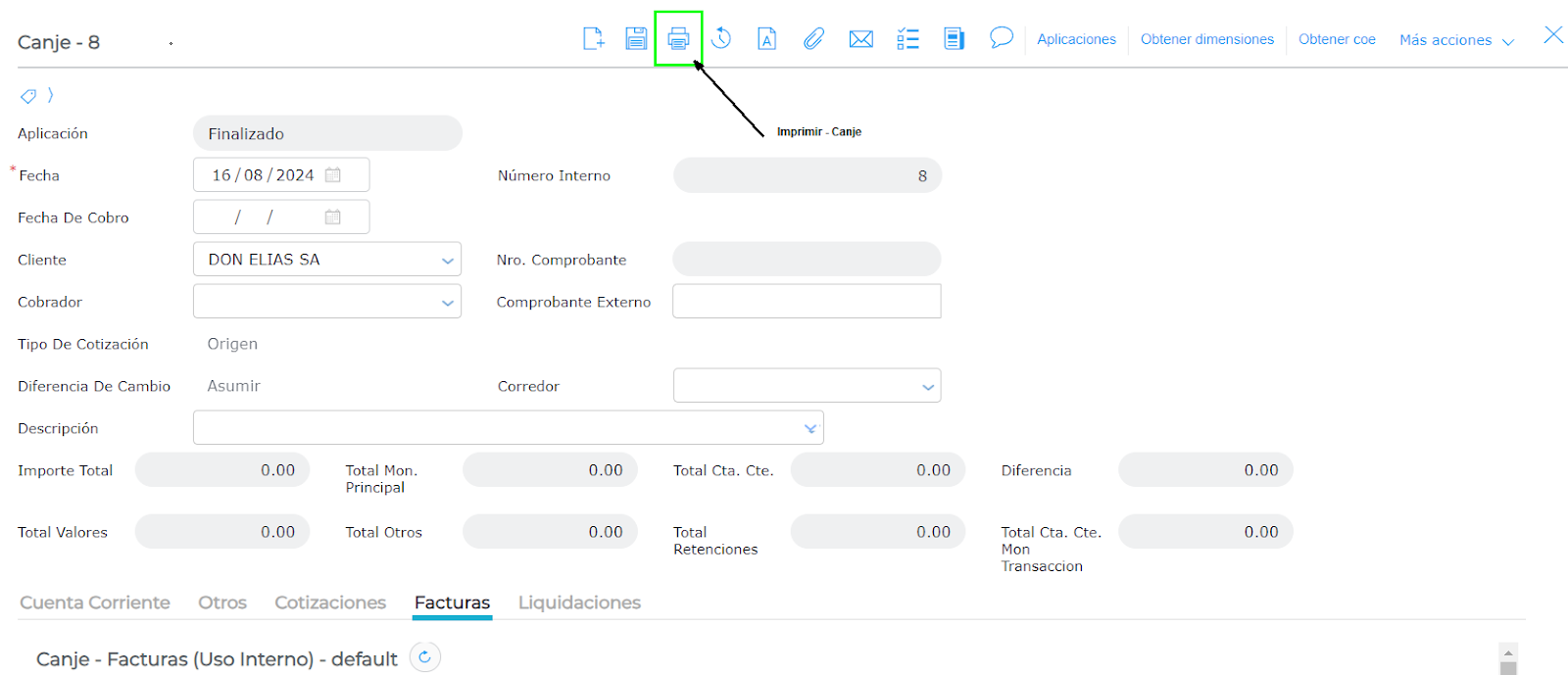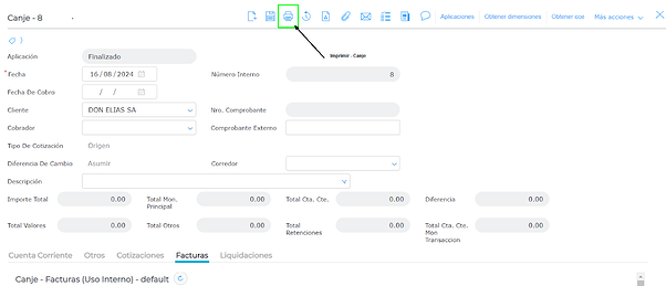 Esta funcionalidad permite visualizar e imprimir los documentos vinculados que intervienen en la operación de canje. Emitir el comprobante entre la liquidación y los documentos en concepto de cancelación.