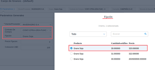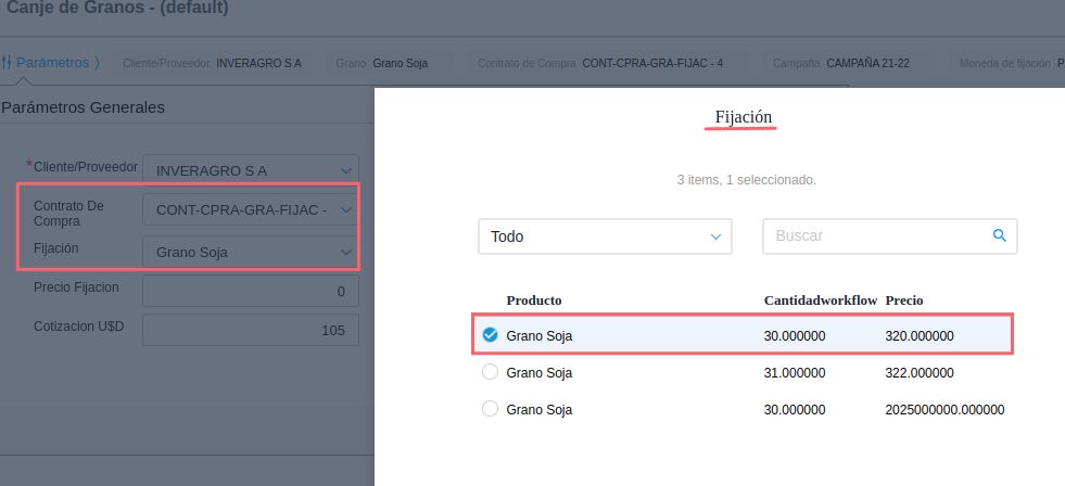 - Fijacion: Este selector permite definir la fijación que se quiere usar en el canje de granos (son las fijaciones del contrato seleccionado anteriormente, las mismas ya tienen una moneda definida).
