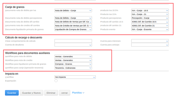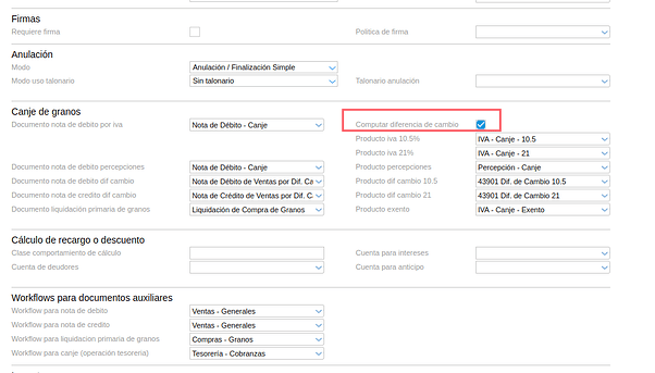 Se debe configurar la transacción CANJE, con todos sus componentes correspondientes (documentos de NC/ND, Liquidación de Granos, productos para diferencias de cambio y percepciones).