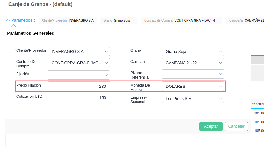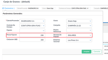 - En caso de que el contrato no tenga las fijaciones necesarias al momento de ejecutar el proceso de canje desde este tablero, el usuario puede ingresar de forma manual el precio y la moneda de la fijación en los parámetros, de esta forma al correr el proceso de canje se dará de alta la fijación en el contrato automaticamente.