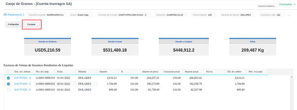 - Seleccionar las facturas de venta de insumos a canjear para definir la “Deuda a Canjear”