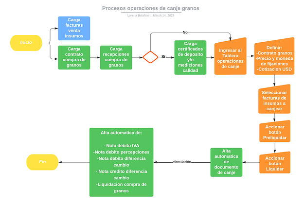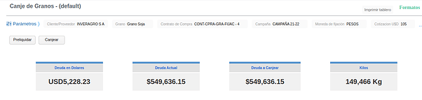 Este tablero permite ejecutar de forma automática el proceso de canje de granos teniendo en cuenta la deuda actual de una organización por cualquier concepto (insumos y servicios) y las recepciones de compra de granos.