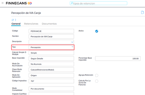 Las percepciones deben clasificarse como “Percepciones” en el maestro de “Tipos de retención:
