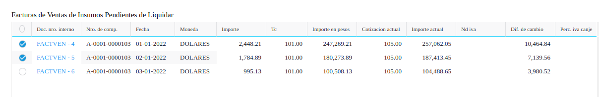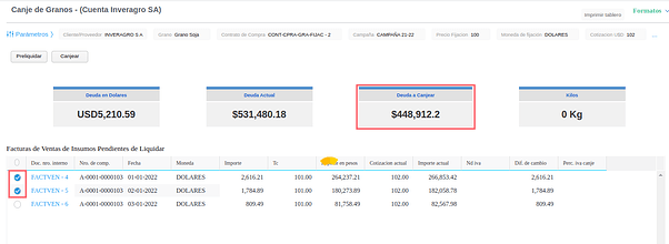 Canje por comprobantes: Seleccion de facturas a canjear que determinan un importe para el cálculo de los kilos de granos a recibir.