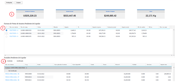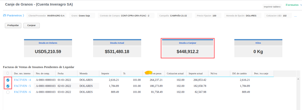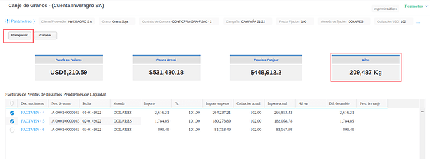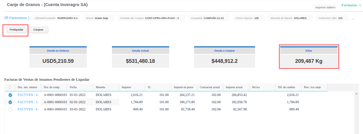 - Luego hacer click en el boton “Preliquidar” para conocer los kilos de grano necesarios para cubrir la deuda a canjear