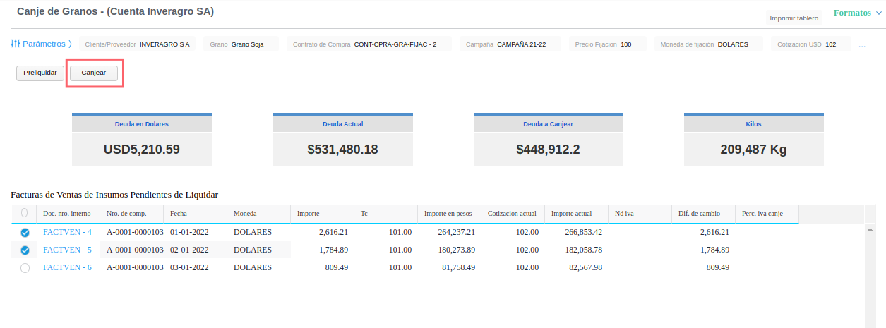 Canje por kilos de semilla: Realiza el proceso de canje de granos de forma automatica teniendo en cuenta la deuda actual por semilla (facturas de venta) y las recepciones de compra de granos.