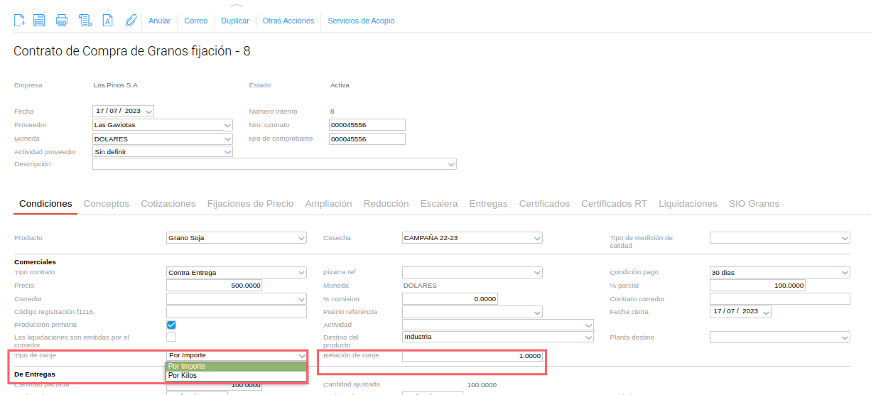 - Previamente debe existir un contrato de granos compra fijaciones con “Tipo de canje: Por Importe” y su “Relacion de canje”