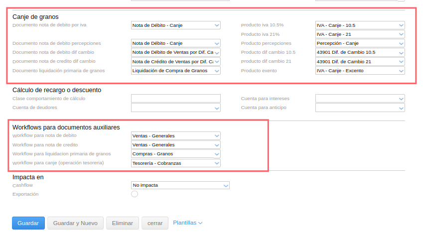 En el tipo de documento de Canje, definir cada uno de los documentos auxiliares, productos y workflow: