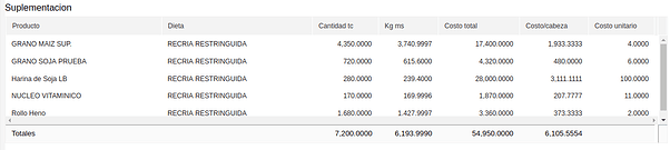 -Consumo MS (Kg/Animal/Dia): Por cabeza, los Kg de materia seca salen de la suplementaciones otorgadas en el periodo a la tropa indicada (KG MS / Duración) / (Cabezas en Stock + cabezas salidas)