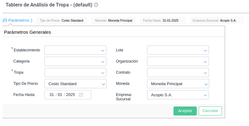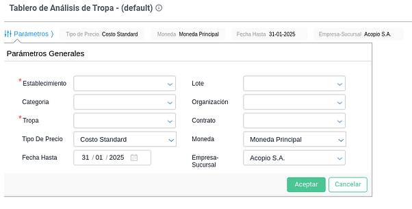 Se completan los siguientes filtros para que el sistema genere el análisis. El mismo permite seleccionar una sola tropa a la vez: