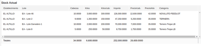 -Peso Final (Kg/Cab): Indica el peso final de la tropa, contemplando los animales que aún quedan en stock a la fecha “Hasta” y los animales que ya salieron de la tropa (KG en stock + Kg Salida)/ (Cabezas en Stock + Cabezas Salidas)