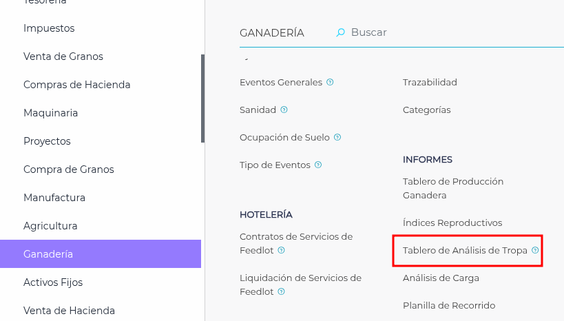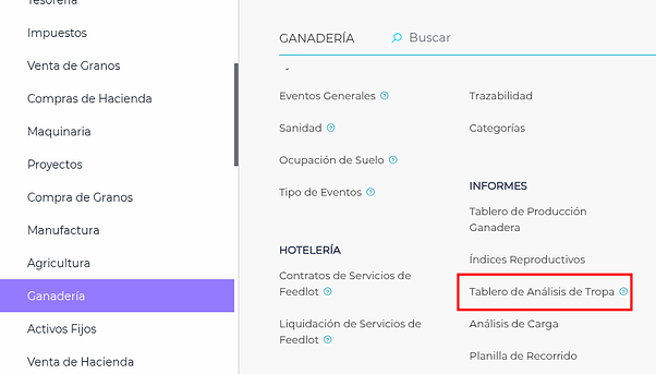 Para ver este informe accede desde el Menú desplegable → Gestión Empresarial → Ganadería → Informes → Tablero de análisis de tropa