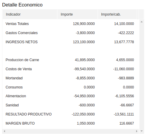 En este recuadro se visualizan los indicadores económicos por importe total e importe/cab, teniendo como resultado los ingresos netos, el resultado productivo y el margen bruto.