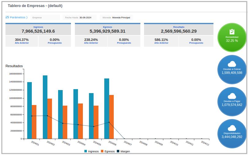 Disponibilidades: Indica el total de cobranzas, órdenes de pago y asientos realizados. Representa el monto monetario disponible a favor o en contra, en función de pagos y gastos asentados.