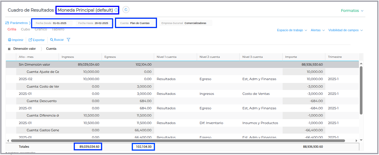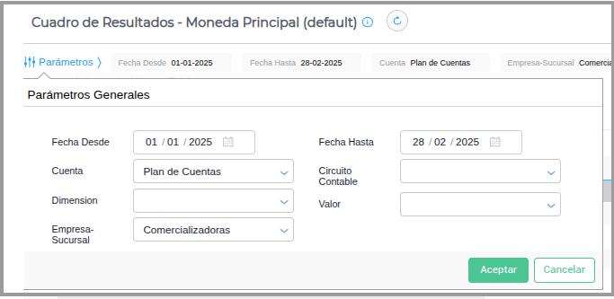 Entonces ir a Menú → Gestión Empresarial → Contabilidad → Cuadro de resultados, como parámetro fecha hasta 28/02/2025 y en el parámetro cuenta se elige el árbol plan de cuentas.