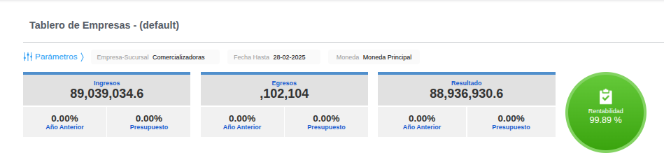 Ir a Gestión empresarial → Presupuesto → Tablero de empresas, desde los parámetros indicar fechaHasta y Empresa a analizar: