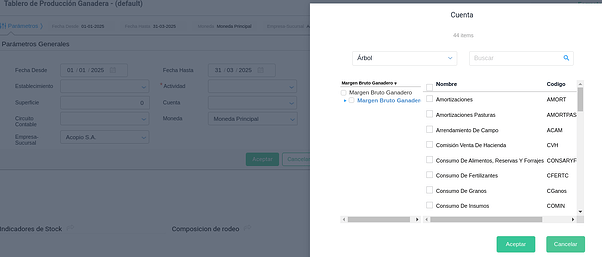 Cuenta: se debe seleccionar el árbol sobre el cual se establecerá el resultado ganadero