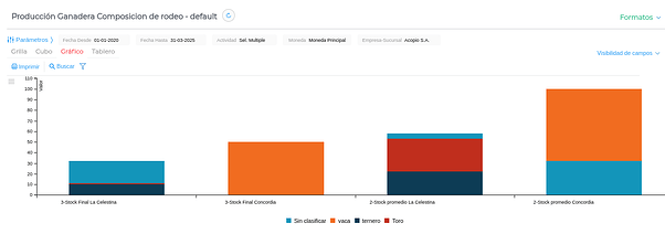 Este gráfico permite conocer la composición de cabezas del rodeo y su variación en el periodo. El gráfico es de tipo barras y genera tres por establecimiento (inicial / Promedio / Final). A su vez, cada barra se muestra dividida por segmentos de categorías.