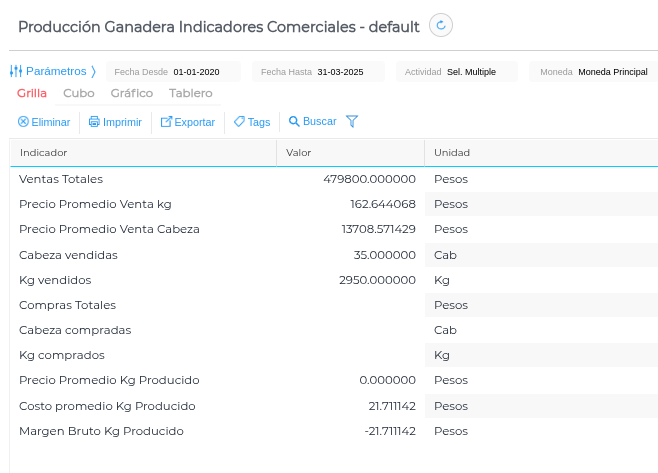 Cabezas Compradas: sumatoria de Cabezas (Unidad Principal) de documentos de compra de hacienda según los parámetros generales. Los documentos de compra de hacienda deben estar vinculados a su correspondiente recepción de hacienda para que el sistema lo tenga en cuenta a la hora de hacer la sumatoria