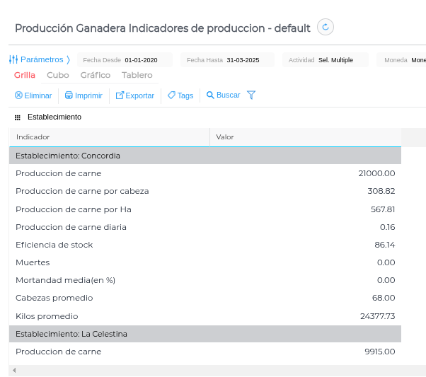 - Precio promedio Kg producido: “Valor de producción” / “Producción de carne”. Donde el valor de producción es la suma de los importes de las cuentas contables de valorización hacienda, marcadas con el tag de tipo general “PCI”.