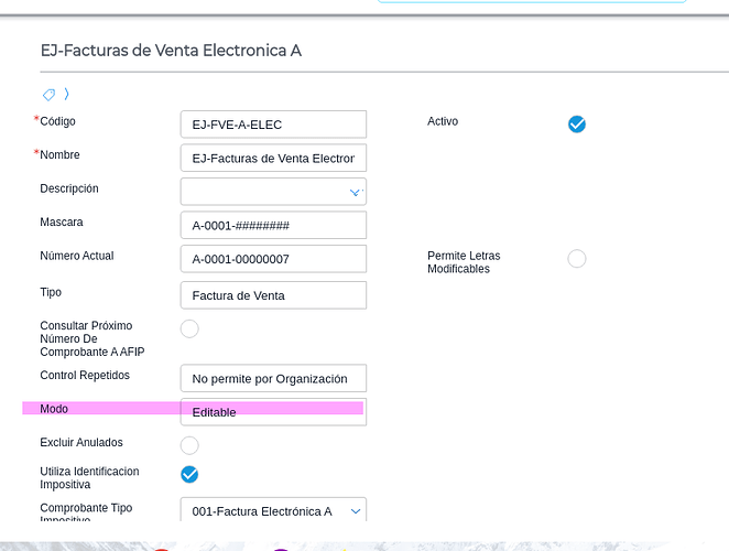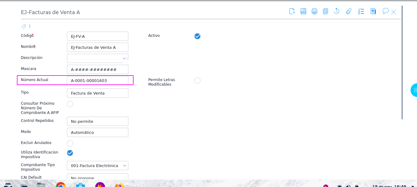 Seleccionar el talonario a modificar y colocar como número actual el último número de la factura que esté correctamente realizada.
