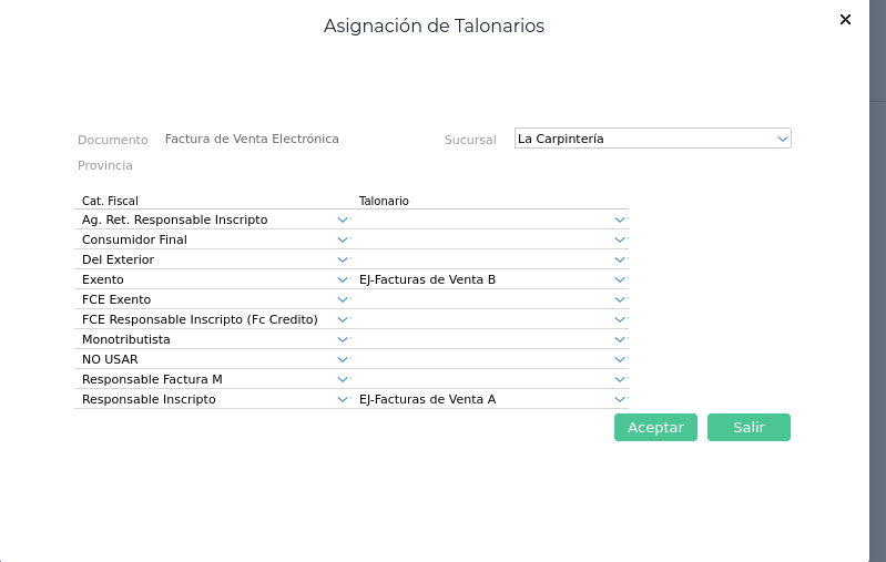 4- Al seleccionar Asignar Talonarios se puede observar el talonario que tiene asignado el documento según la categoría fiscal por la cual se generó el documento.