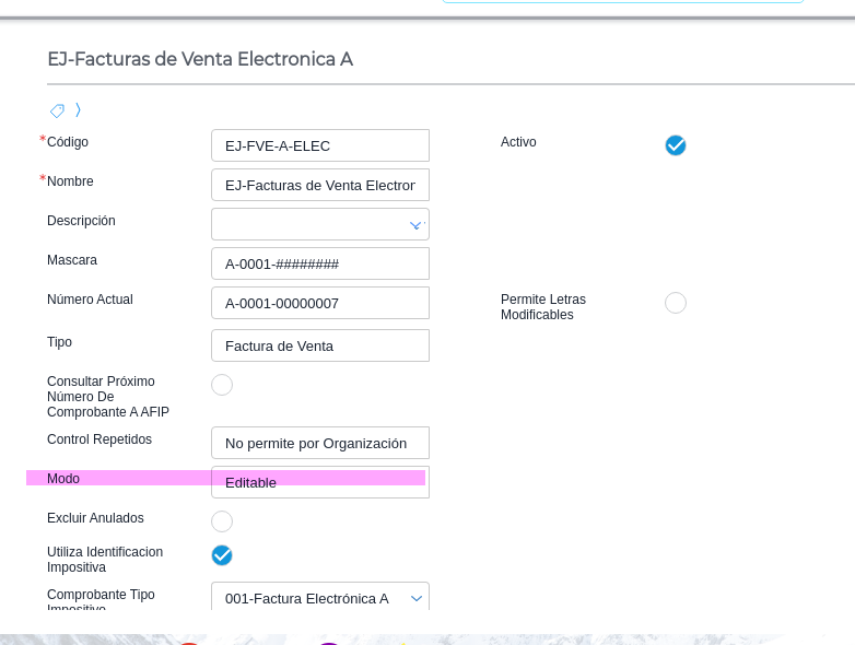 Configurar el talonario que tiene asignado la factura de venta para que el campo “Modo” sea editable para poder corregir la numeración en la carga de la factura.