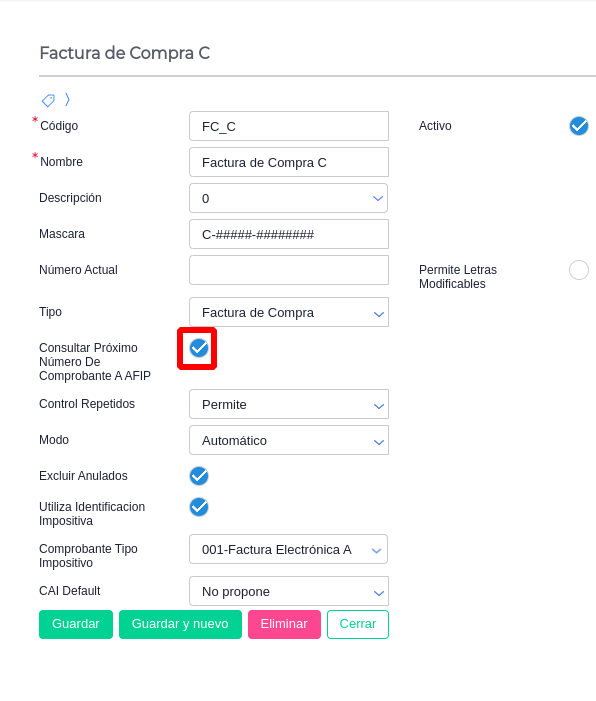 Verificar si el talonario tiene el seleccionado el check “Consultar Próximo Número De Comprobante A AFIP”