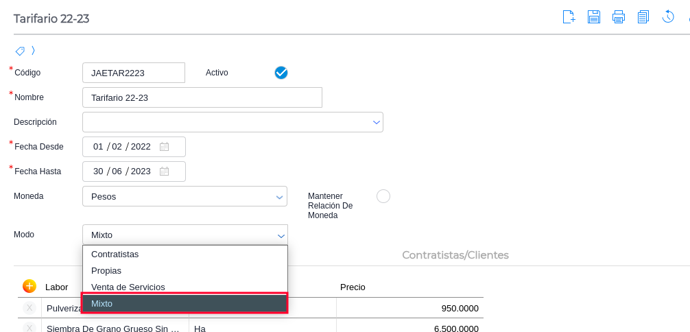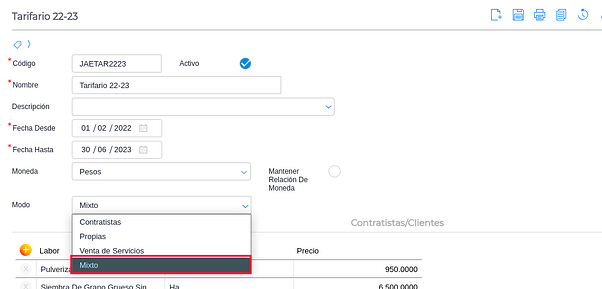 Para esto vamos a Agricultura → Gestión → Tarifario de Labores. Damos de alta, o duplicamos un tarifario existente y en el selector de “Modo” elegimos el tipo “Mixto”.