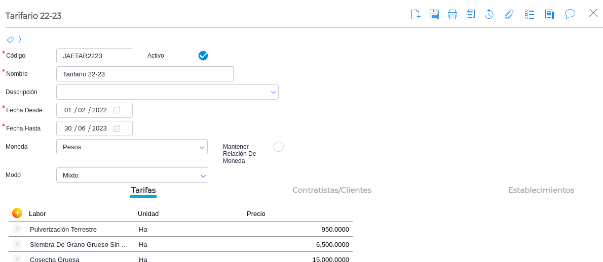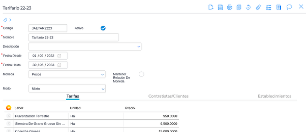 Se generó la posibilidad de crear un nuevo tipo de Tarifario, el cual sirve tanto para compras como para ventas. Esto significa que puede ser usado en labores de tipo “Compra” con maquinaria propia o contratada, así como laboreos de tipo “Venta” como es el caso de los laboreos de venta de servicios. Con el solo objetivo de facilitar la carga de datos.
