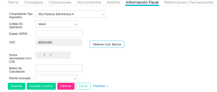 A su vez, dentro de la transacción que no se encuentra timbrada y que se va a asociar a una Nota de crédito, en la solapa de información fiscal es necesario completar el campo cdc manualmente con el número de timbrado que corresponda