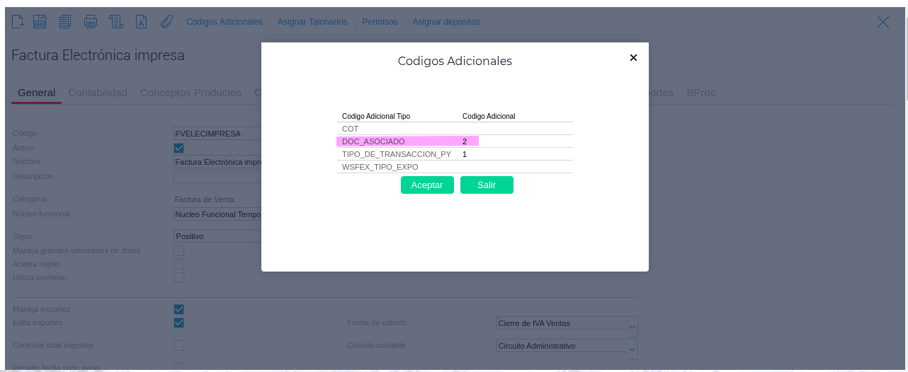 Es necesario configurar dentro de tipo de documento que no fue timbrado electrónicamente y que se va a asociar a la Nota de crédito el código adicional DOC_ASOCIADO con el valor 2