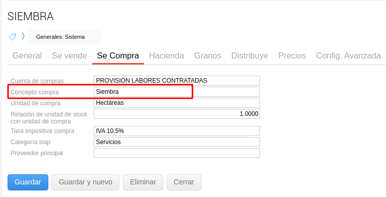 - Operación - Inventarios - Productos - Ir a la solapa de Se Compra - Mirar qué concepto de compra tiene configurado
