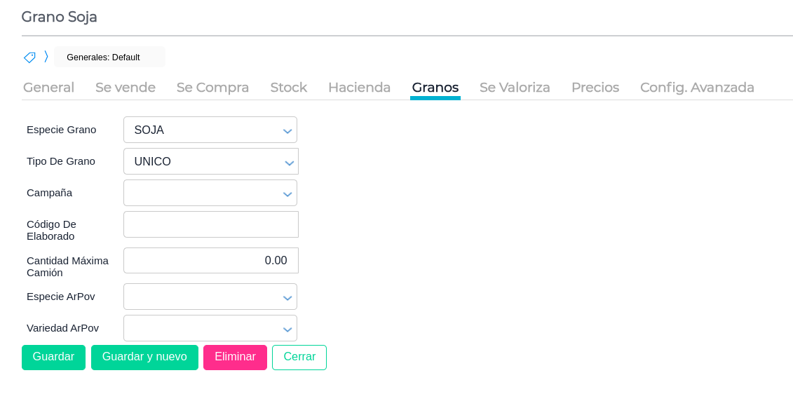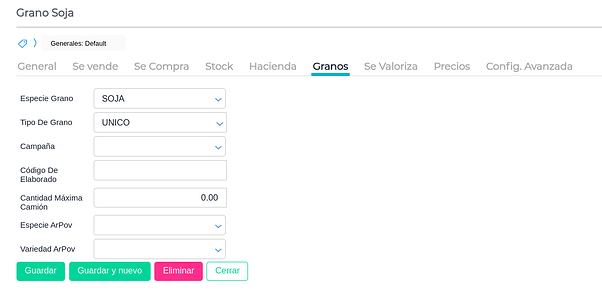 - Además, en la solapa “Granos”, se indica la Especie y Tipo (ya vienen definidos en el sistema ambos datos). Esta configuración también debe estar correcta para trabajar de modo integrado con el Web Service de AFIP (por ejemplo, para la obtención de CTG):